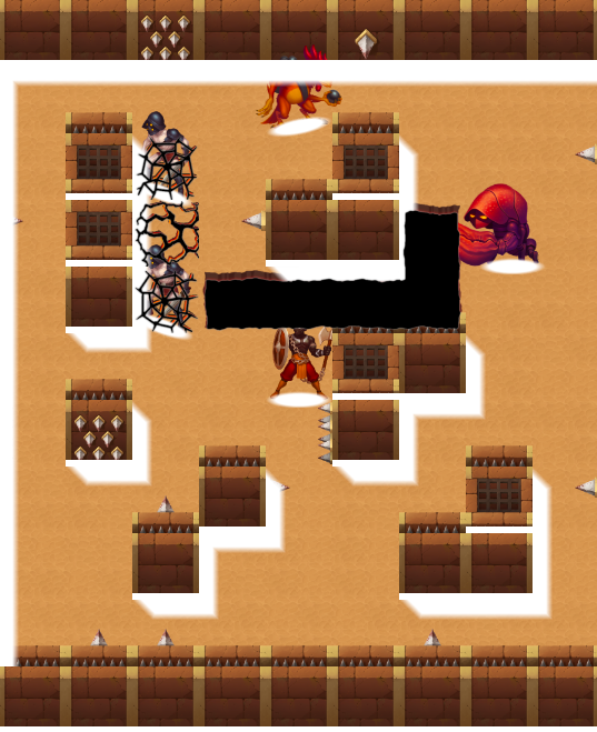 For Axor I wanted shadows below each combatant and below and to the right of each wall tile. The classic solution would be to draw translucent shadow sprites & tiles and perhaps use alternate ground tiles with baked-in shadows. There are two problems with this traditional overlay approach: