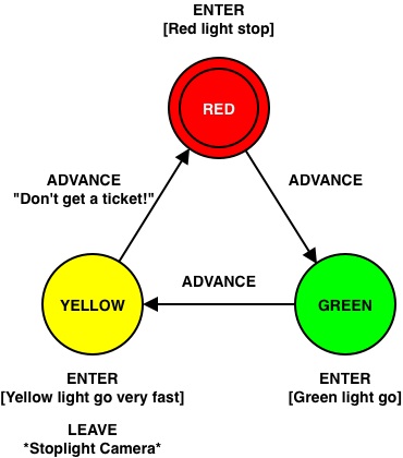 There are three states, RED, GREEN, and YELLOW. The only input is an ADVANCE signal. Certain messages are displayed on ADVANCE and/or when we ENTER or LEAVE a state - we'll broadly (and informally) classify ENTER and LEAVE as signals as well.
