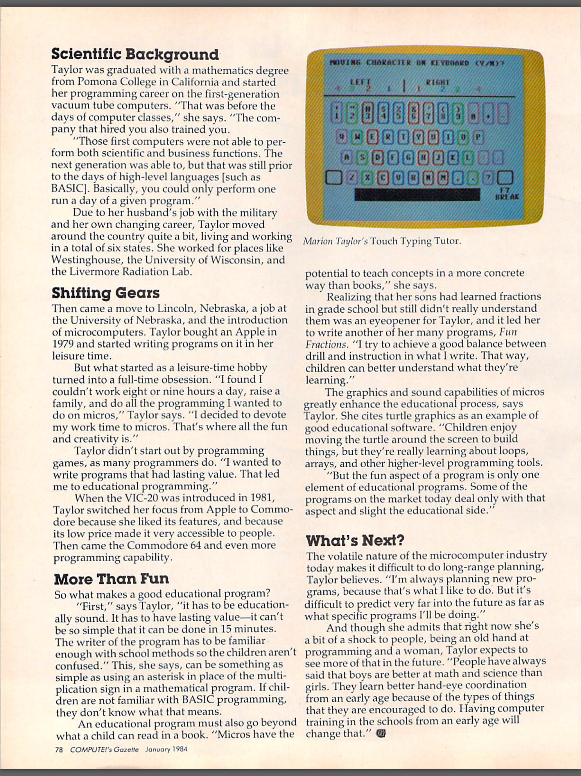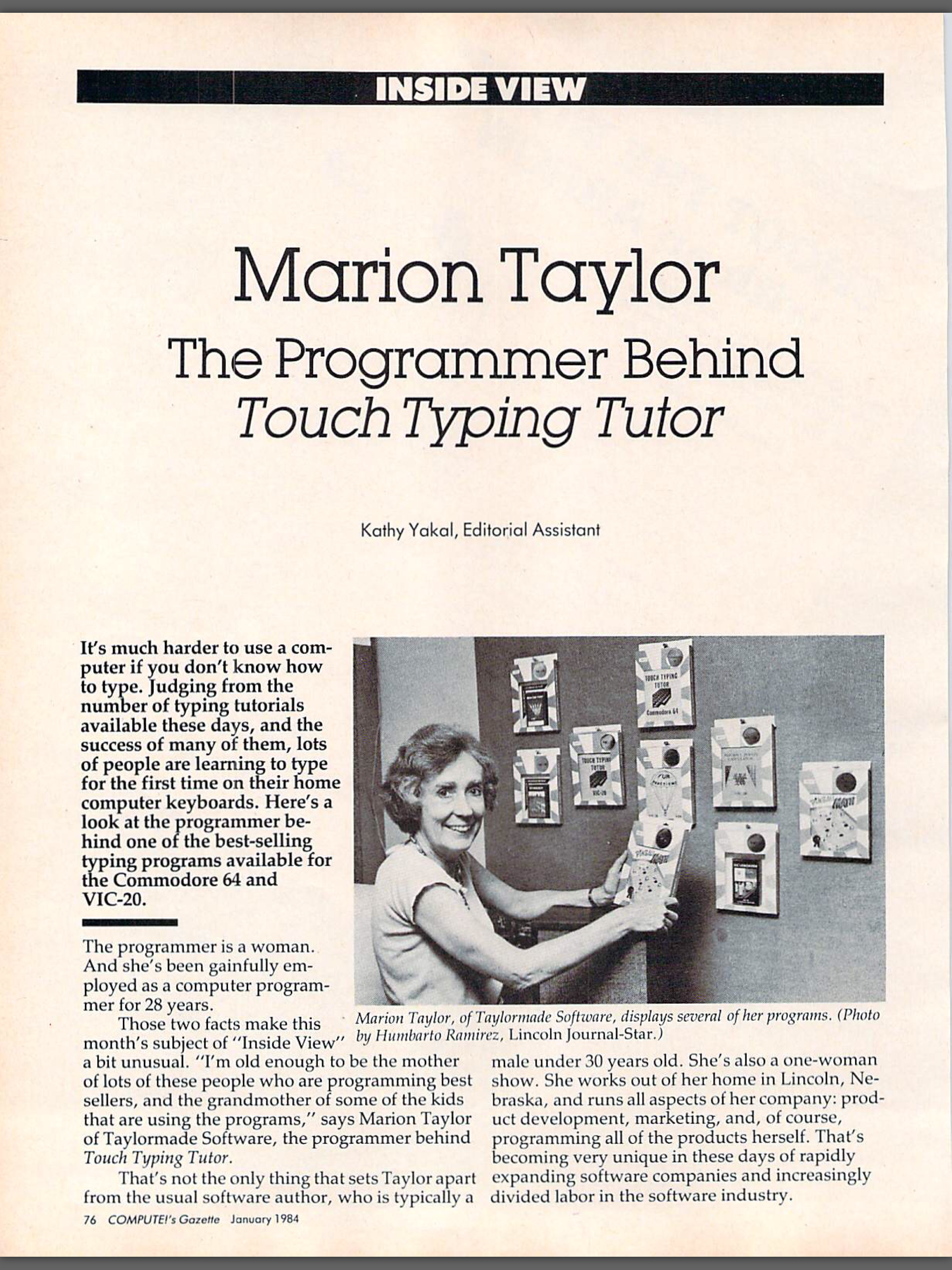 I've been slowly skimming through the complete digital archive of COMPUTE!'s Gazette, a magazine for Commodore 64 users that was popular in the 80's, and I enjoyed reading this article from Issue #7 in 1984. It's neat to see a woman succeeding in a field that was already skewing towards men, an entrepreneur succeeding at a time when successfully self-publishing was quite rare, and an OG programmer thriving in the new world of garage hackers.