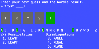 Wordle itself is a fun little game and an instant classic. It's Mastermind but with words instead of combinations, and letters instead of colors. Only problem is: I'm not that good at word games. I have an excellent command of the English language and even better critical thinking skills, but somehow that doesn't translate into figuring out what letters might fill in the blanks for something like _RO_T. I suppose practice will improve my abilities there, but in the meantime the idea of making a program to solve Wordle puzzles for me was instantly very appealing.