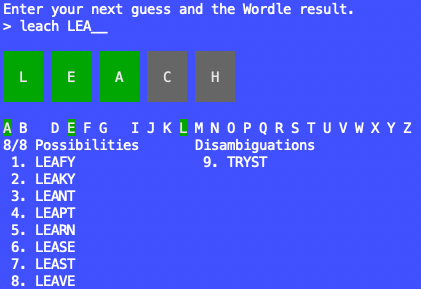 LEAVEWordle Buddy tackles this by providing disambiguation words. These words usually cannot be the solution but they are composed of the "other" letters (besides LEA) that will help quickly zero in on the solution. For example, here's Wordle Buddy's answer to the LEACH input with LEA__ result: